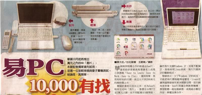 自從在聯合報副刊頭版上看到這則消息時,我就對這項產品一見鍾情。當時介紹了許多資料,可是剪報卻不小心弄丟了,不過幸好今天在中國時報發現了易PC(=EeePC)的介紹,所以馬上就把它掃下來!華碩( ASUS)這次將推出的EeePC,具三種價位。美國方面曾經提出小學生一人一台百元電腦,不過華碩這批EeePC最低價位確仍在199美元,另外兩種分別為299、399美元,硬碟大小也以2G起跳。